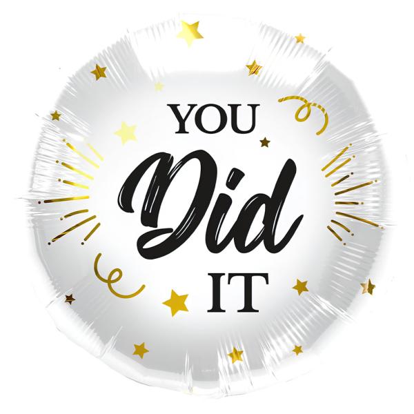 Foil-ilmapallo You Did It sisältää kiiltävän valkoisen ja pyöreän folioilmapallon, jossa on musta teksti "You did it", kultaisia tähtiä ja yksityiskohtia ympärillä. Ilmapallo on noin 45 cm leveä ja täytetty ilmalla tai heliumilla ja sen tilavuus on noin 18 litraa.