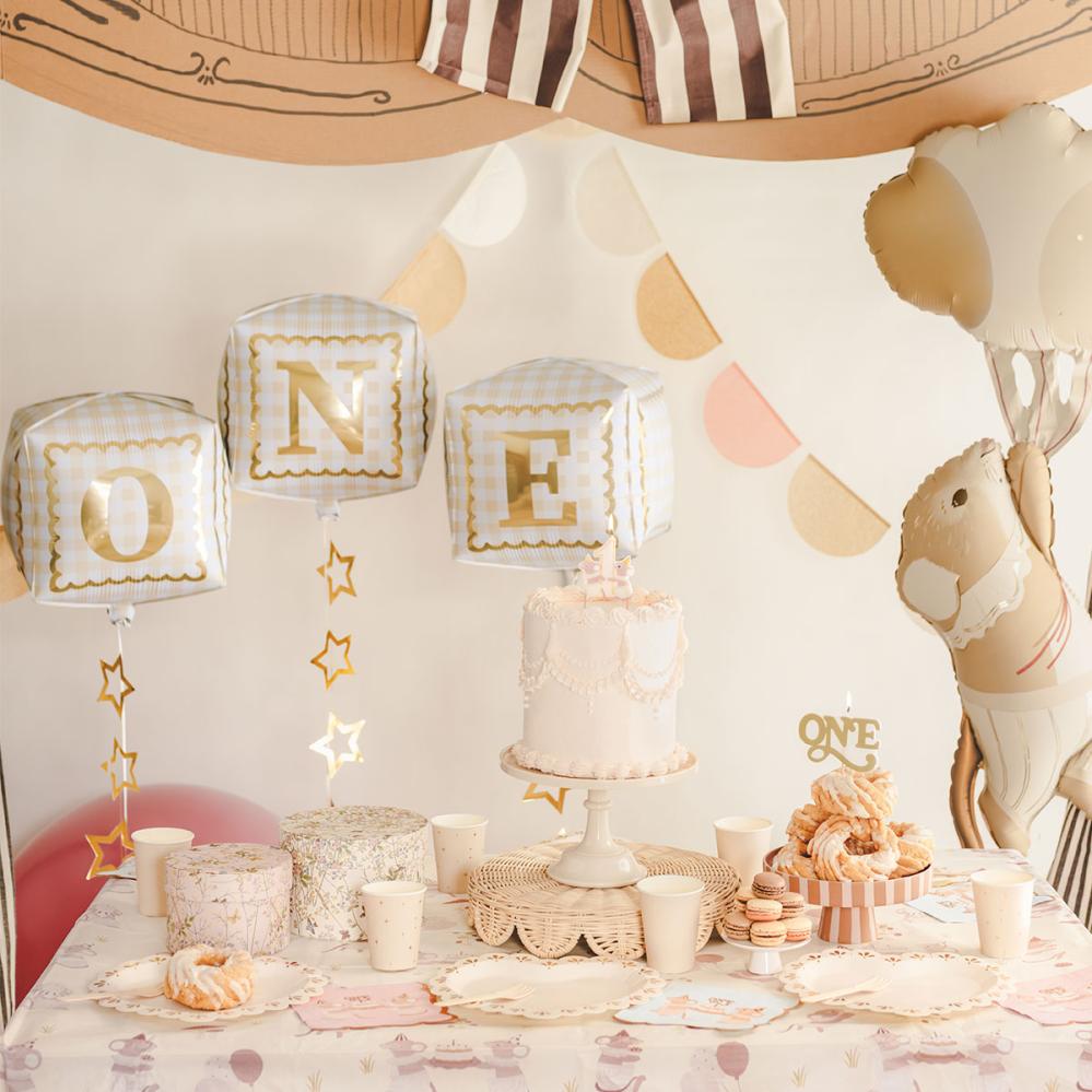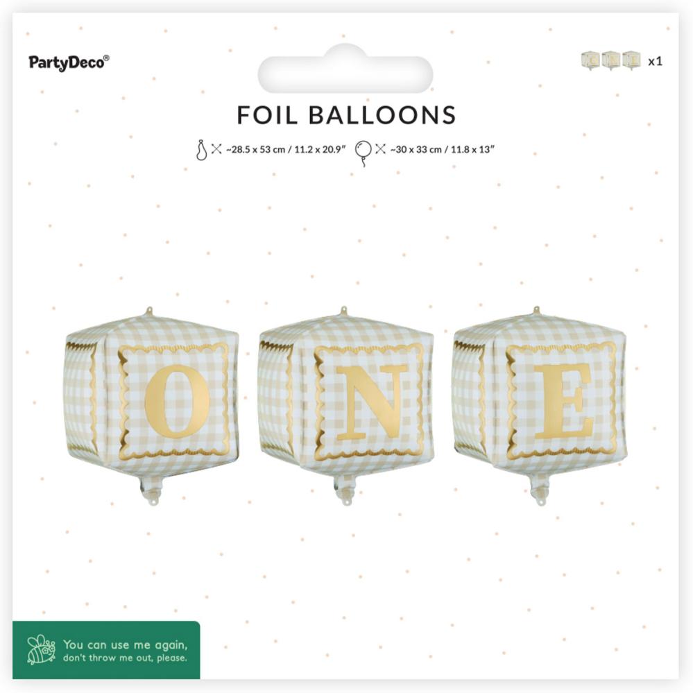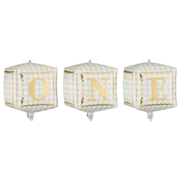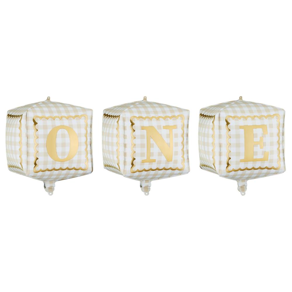 Folioilmapallot One-kuutiot 3 kpl sisältää setin, jossa on kolme kuutionmuotoista ilmapalloa kermanvärisenä ruutukuviolla ja kultaisilla yksityiskohdilla. Jokainen ilmapallo on koristeltu suurella kullanvärisellä kirjaimella, ja vierekkäin asetettuina ilmapallot muodostavat sanan 'ONE'. Ne voidaan täyttää ilmalla tai heliumilla, ja mukana toimitetaan pilli täyttämistä varten.