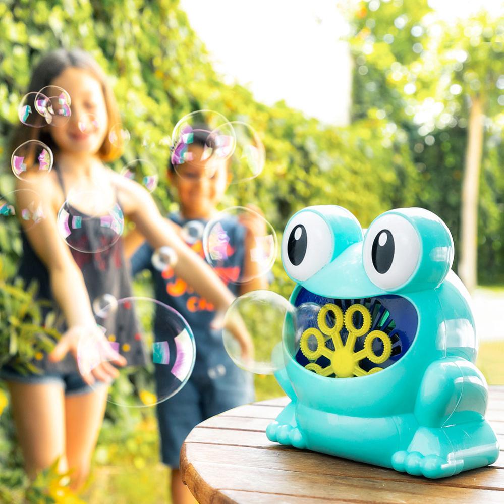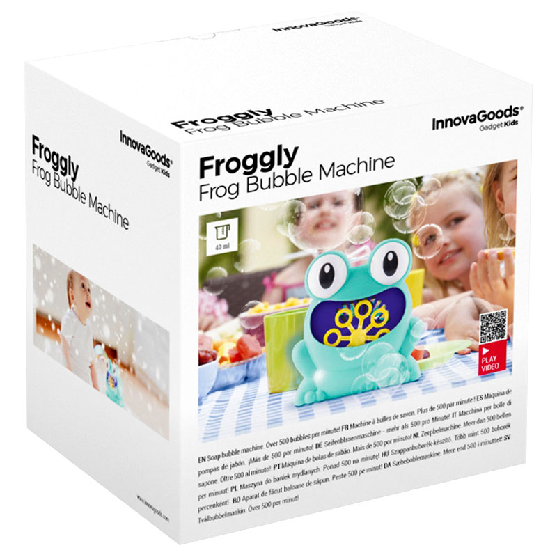 Froggly Bubble Maker sisältää muovisen kuplavalmistajan, jossa on suloinen sammakko, joka voi puhaltaa yli 500 kuplaa minuutissa. Laita saippuakuplanestettä sammakon suuhun ja käynnistä painamalla virtapainiketta. Saippuakuplakone toimii 4 x AA-paristolla ja sitä voidaan käyttää vain tietyn saippuakuplanesteen kanssa. Voidaan käyttää sekä sisällä että ulkona. Mukana ohjeet oman saippuakuplanesteen tekemiseen.
