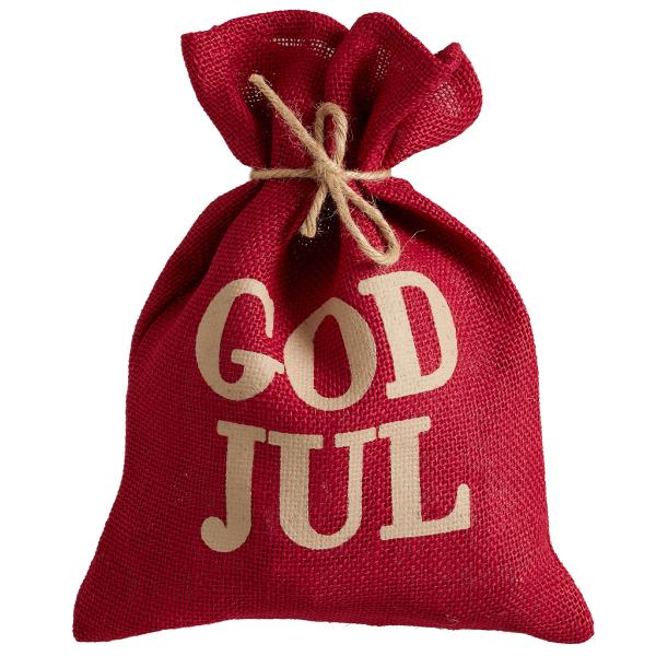 God Jul Joululahjasäkki 38 cm on punainen juuttikankainen joululahjasäkki, jossa on beige teksti "God Jul". Säkillä on beige köysinauha suuaukon sulkemista varten.