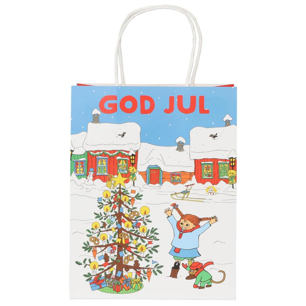 God Jul Lahjakassi Peppi Pitkätossu sisältää lahjakassin, jossa on valkoiset kantokahvat ja jota koristaa värikäs joulukuva Peppi Pitkätossusta ja hänen apinastaan Herra Nilssonista sekä punainen teksti "GOD JUL".
