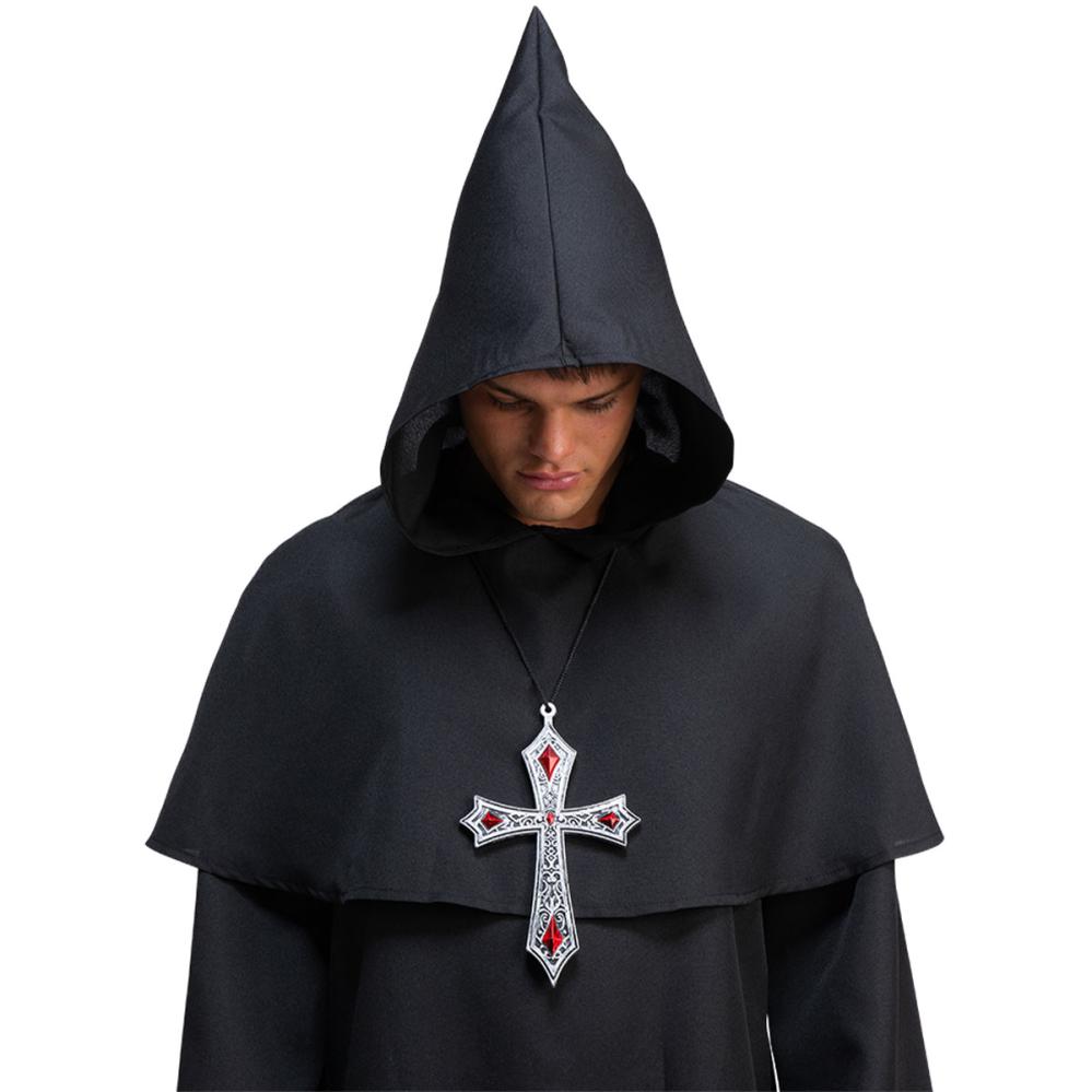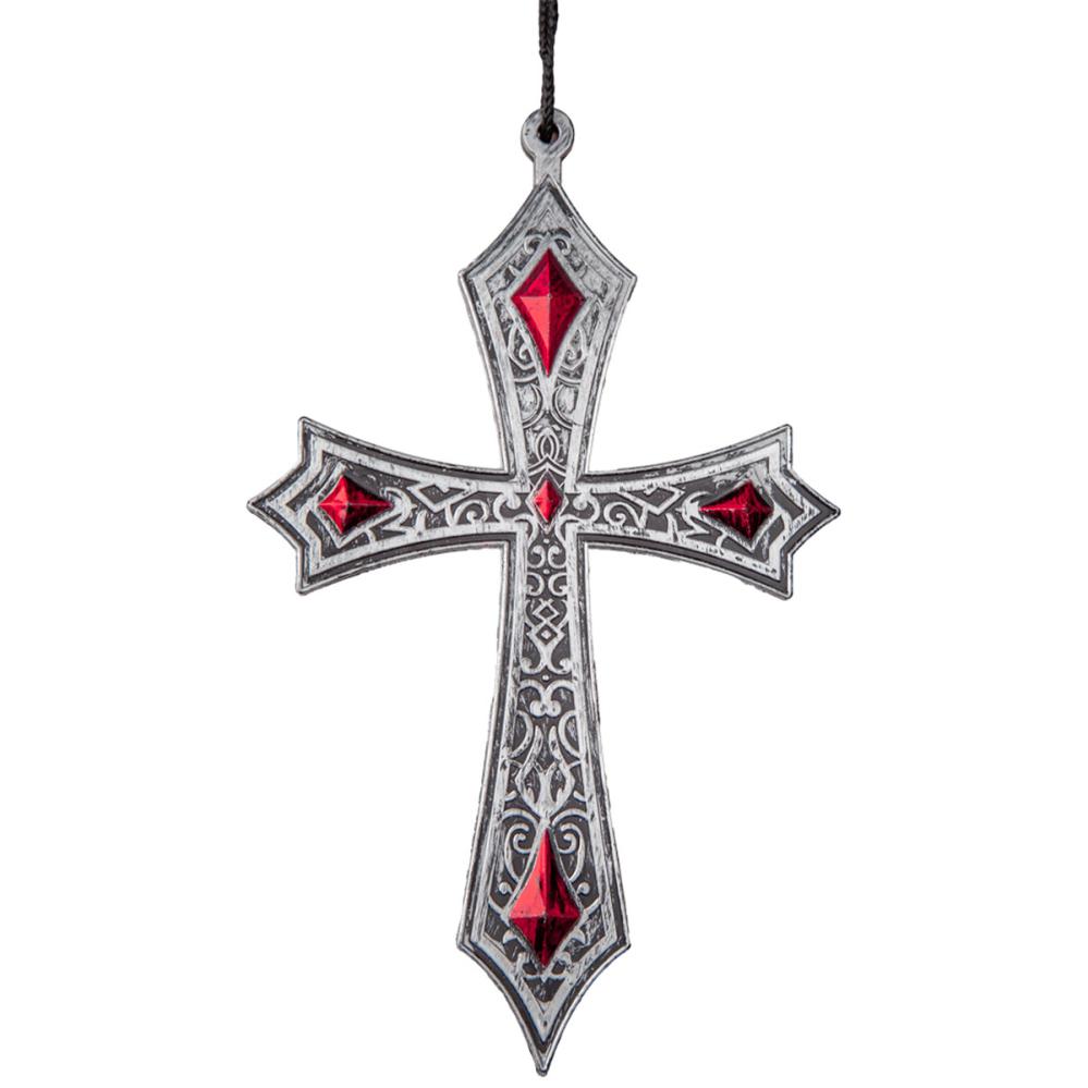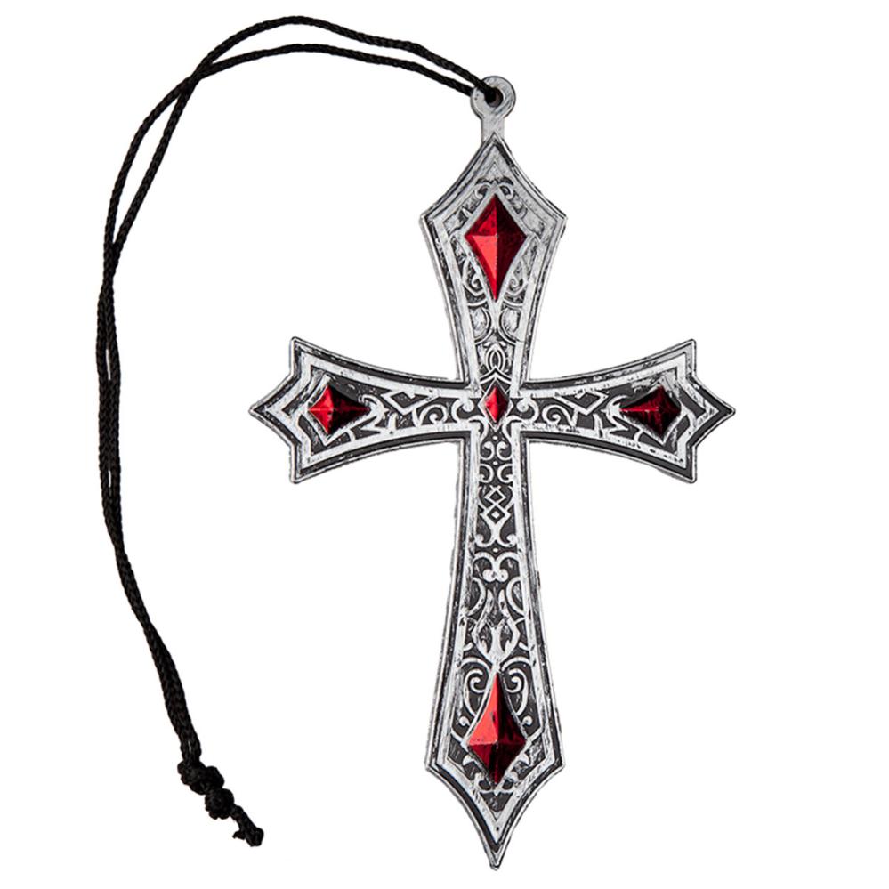 Goottilainen Halloween-risti, joka viimeistelee vampyyrityylisi. Aidonnäköisellä hopeapinnalla, punaisilla jalokivillä ja mustalla nauhalla tästä vampyyrirististä tulee täydellinen Halloween-naamiaisasuste eleganttiin asuun.