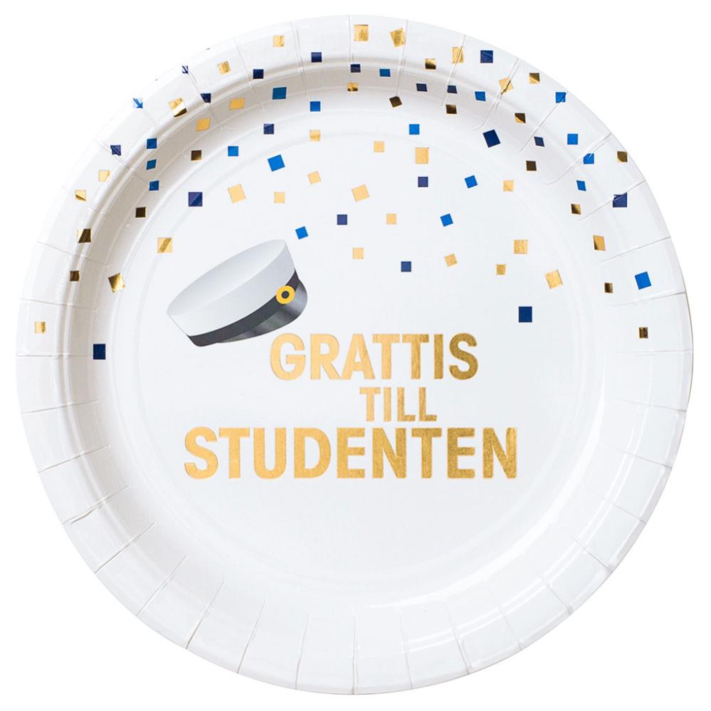 Onnittelut opiskelijalle Paperilautaset sisältävät kertakäyttölautasia valkoisesta pahvista opiskelijalle. Levyissä on opiskelijalakkin kuviot ja pienet siniset ja kullanväriset neliöt. Paperilautaset ovat kooltaan noin 23 cm ja niitä myydään 8 kappaleen pakkauksissa.