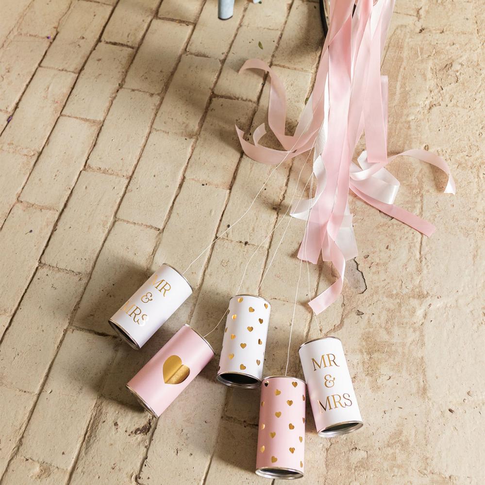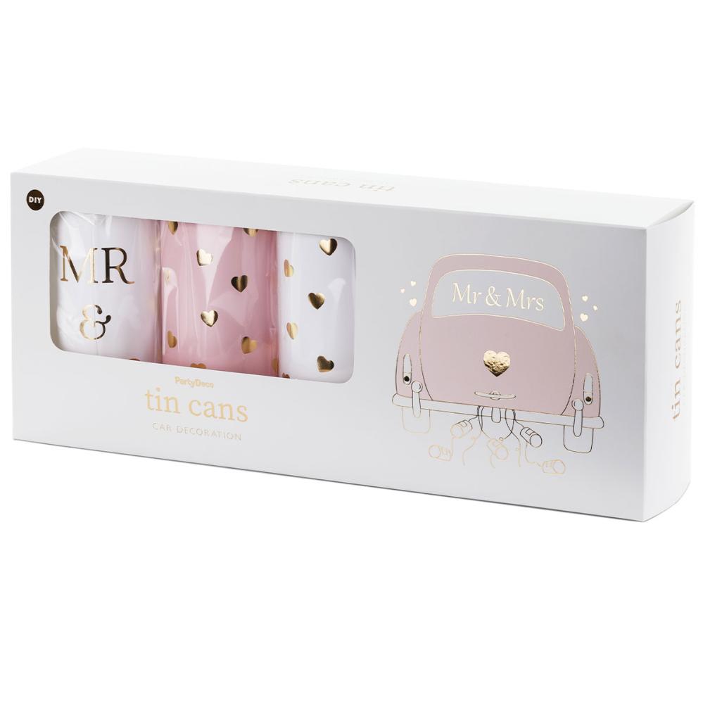 Hääpurkit Mr & Mrs sisältävät viisi purkkia, joissa on vaaleanpunaiset ja valkoiset etiketit, jotka on koristeltu kullanvärisillä sydämillä tai tekstillä "MR & MRS". Purkit kolisevat juhlavasti, kun niitä vedetään auton tai pyörän perässä, ja ne on helppo kiinnittää mukana tulevilla valkoisilla langoilla ja vaaleanroosalla silkkinauhalla.