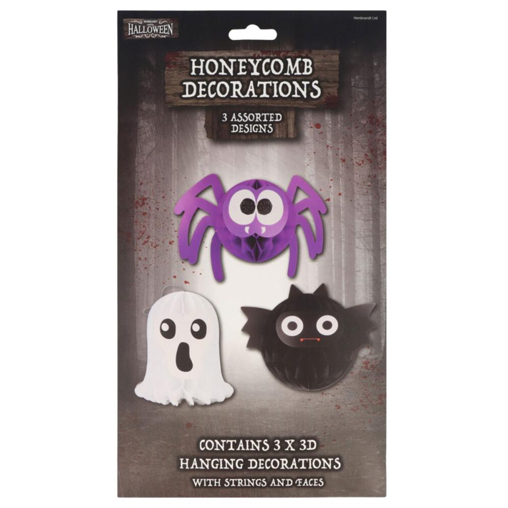 Halloween Honeycomb Koristeet 3-kpl sisältää kolme erilaista honeycomb-koristetta, joissa on valkoinen kummitus, violetti hämähäkki ja musta lepakko, kaikki valmiina ripustettaviksi mukana tuleviin, valmiiksi kiinnitettyihin naruihin. Hahmojen kasvot kiinnitetään itse, mikä hoituu helposti mukana tulevien tarrojen avulla. Settiin sisältyy myös paperiliittimiä, jotka pitävät koristeet koossa.