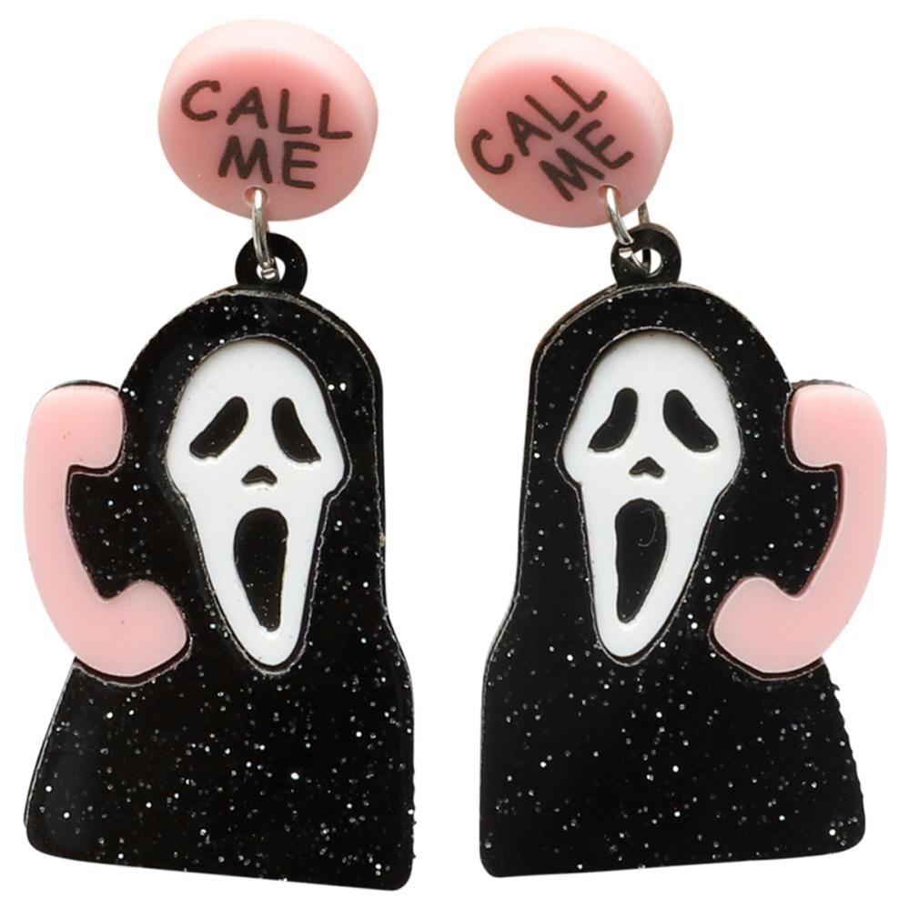Halloween Korvakorut Scream Call Me sisältää parin hauskoja tappikorvakoruja, jotka esittävät Scream-elokuvien Ghostface-kummitusta, joissa on vaaleanpunainen puhelin ja kimalteleva pinta vain mustassa osassa, sekä erillisessä roikkuvassa pyöreässä osassa teksti 'Call me'.