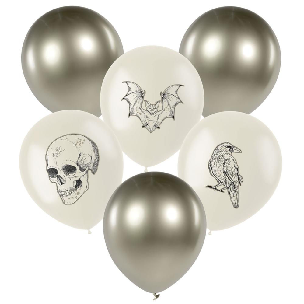 Halloween Lateksi-ilmapallot Mix 6-kpl sisältää pakkauksen, jossa on 6 lateksi-ilmapalloa hopean ja valkoisen väreissä. Valkoisissa ilmapalloissa on piirrettyjä kuvioita, kuten pääkallo, lepakko ja korppi.