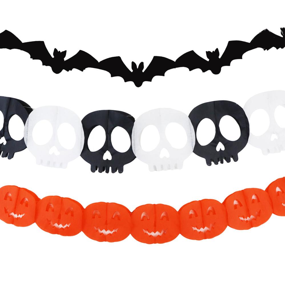 Luo oikea tunnelma halloweenina tällä 3 kappaleen viirinauhapakkauksella. Tämä 3 kappaleen pakkaus on täydellinen halloweenjuhlien koristeluun, aiheina kurpitsat, lepakot ja pääkallot. Se on täydellinen lisä, joka kruunaa halloweenjuhlasi ja luo karmivan tunnelman.