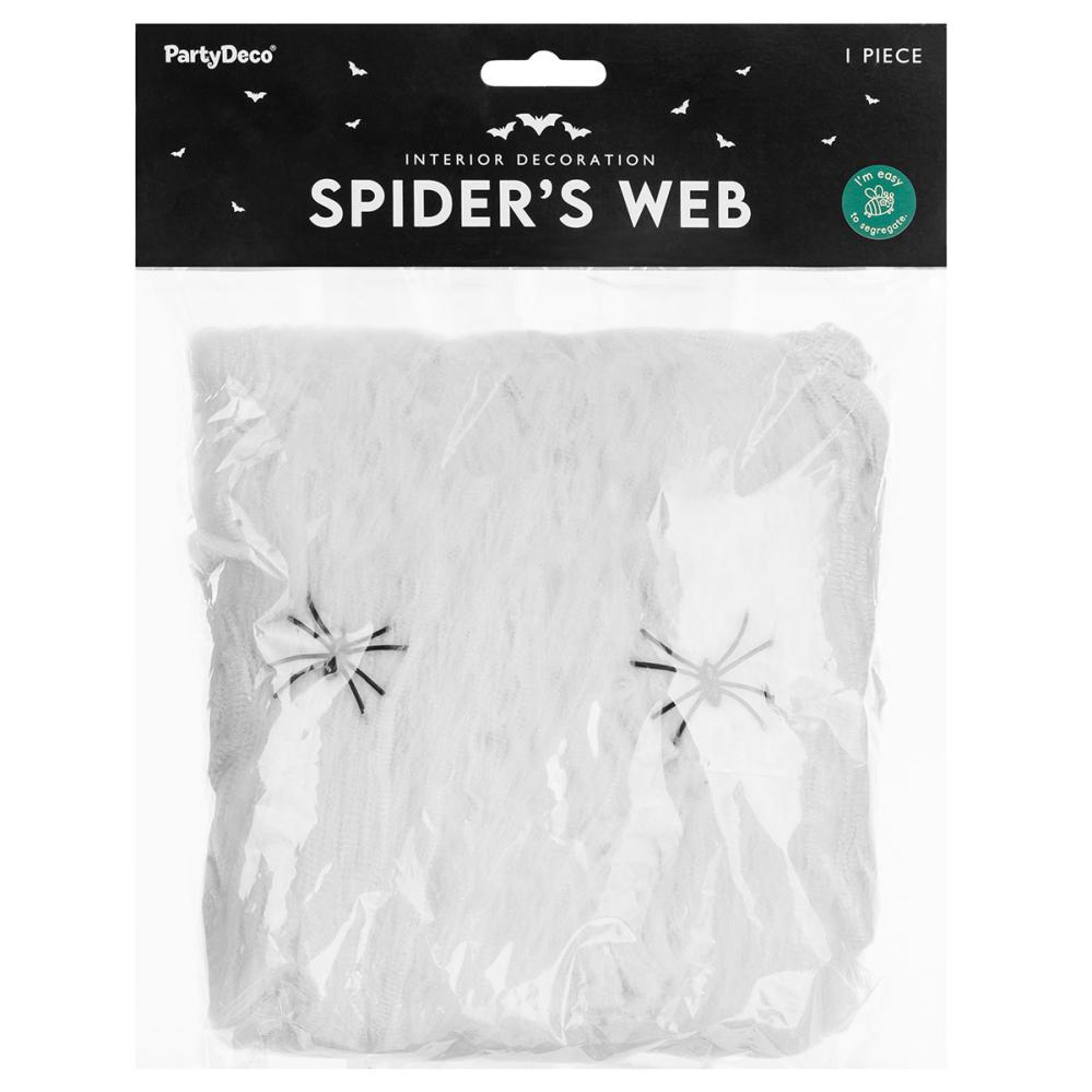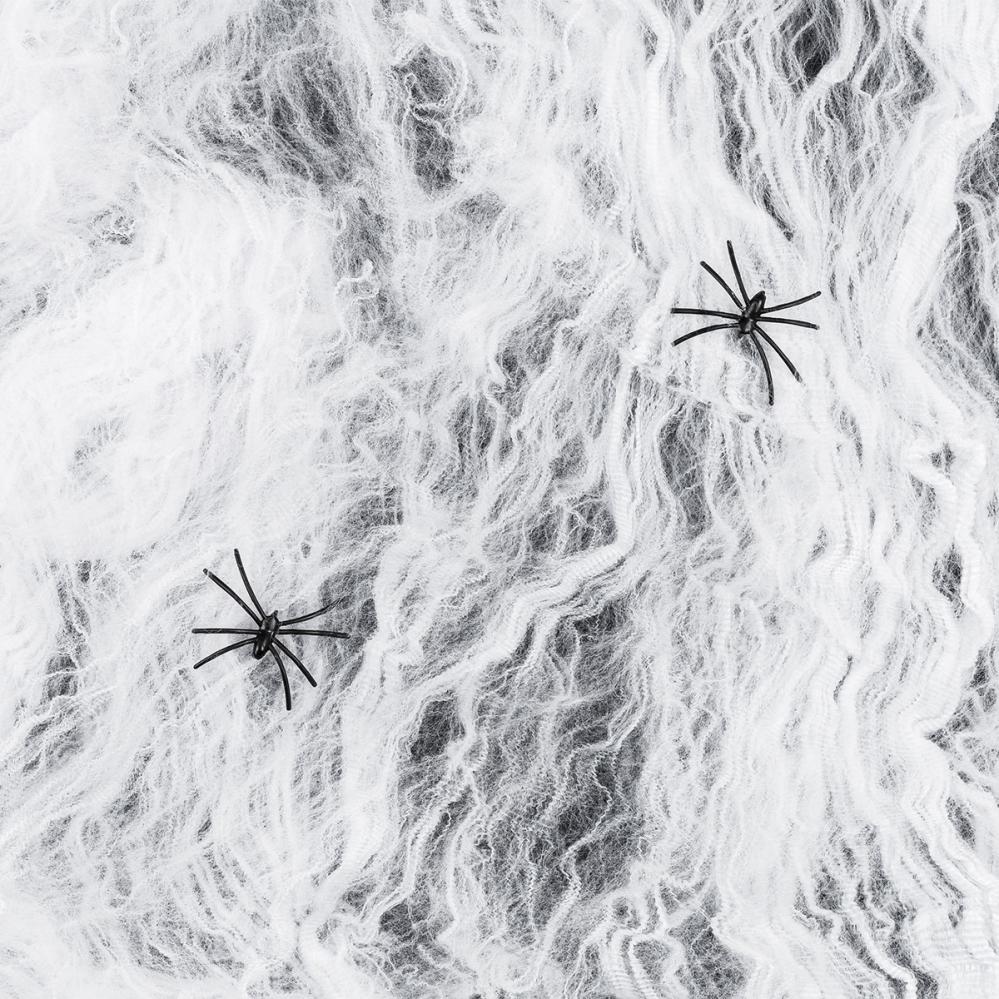 Hämähäkinverkko Hämähäkeillä 200g sisältää 200 grammaa valkoista polyesteristä valmistettua hämähäkinverkkoa sekä kaksi mustaa muovihämähäkkiä.