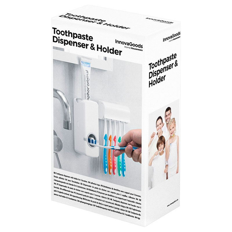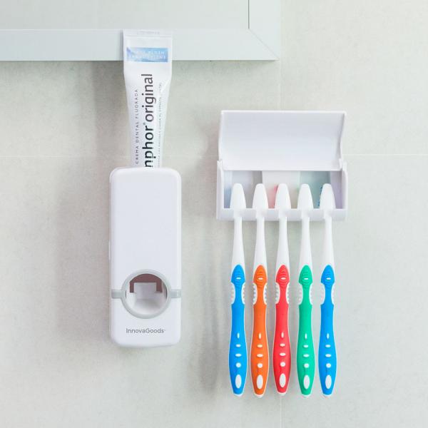 Hammastahna-annostelija ja hammasharjapidike sisältävät hammastahna-annostelijan, joka annostelee helposti täydellisen määrän hammastahnaa hammasharja. Mukana on myös hammasharjapidike viidelle hammasharjalle kannella. Hammastahnan annostelija ja hammasharjan pidike kiinnitetään helposti seinään mukana tulevalla 3M-teipillä.