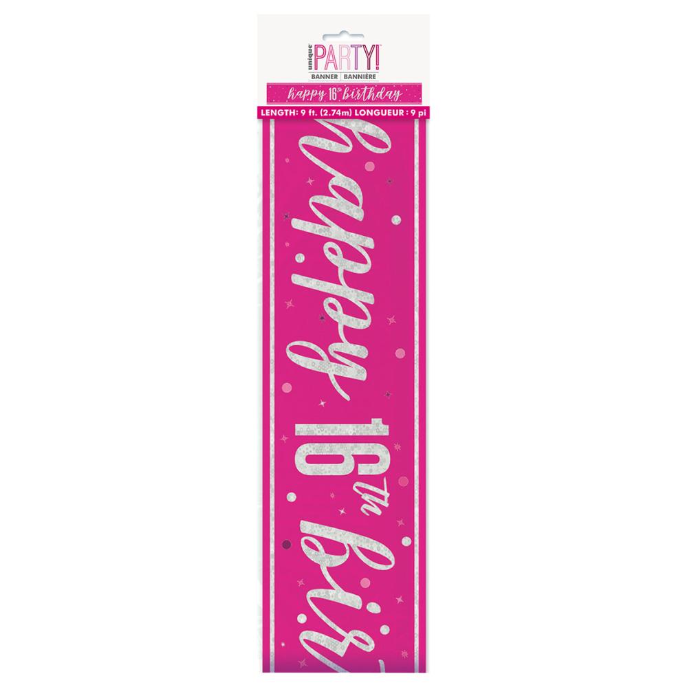 Happy 16th Birthday Viirinauha 2,74 m on cerisenvärinen viirinauha, jossa on teksti "Happy 16th Birthday" holografisella hopealla.