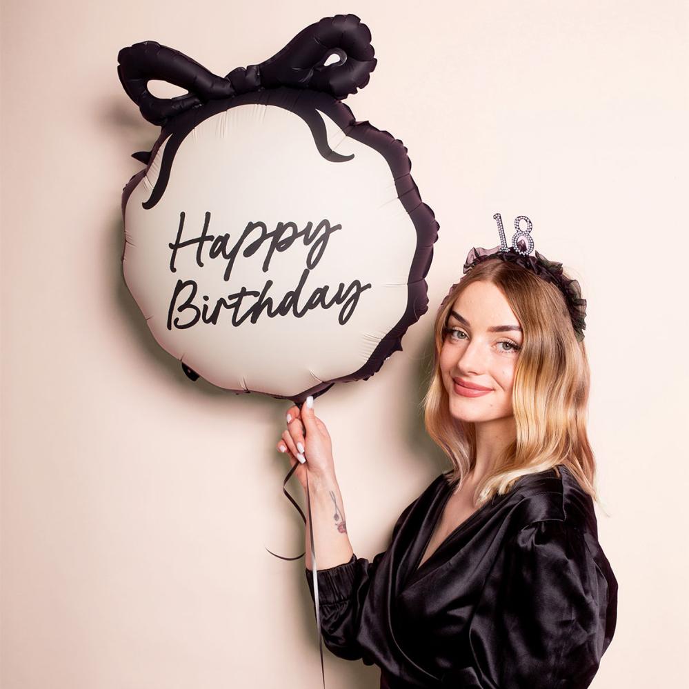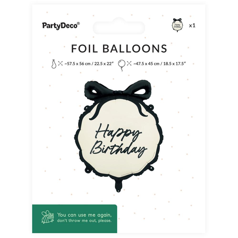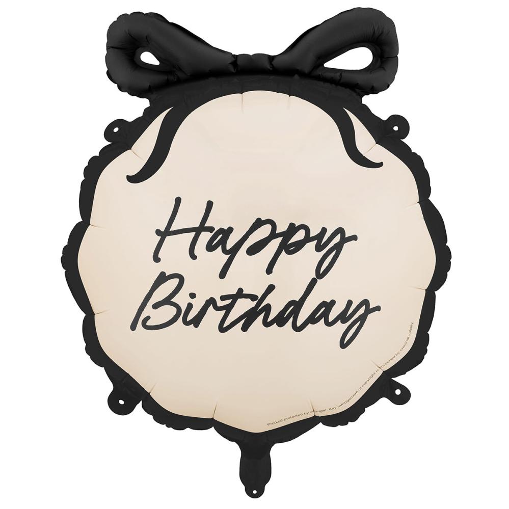 Happy Birthday Folioilmapallo Rusetilla 47,5 x 45 cm on valkoinen ilmapallo, jossa on mustalla kirjoitettu teksti "Happy Birthday", esiin työntyvä musta rusetti ja musta reunus ympäriinsä. Ilmapallo täytetään ilmalla mukana tulevan puhallusputken avulla tai heliumilla.