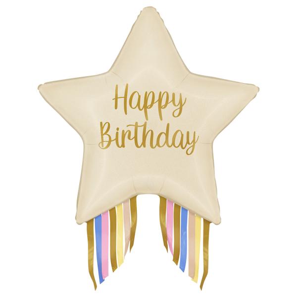 Happy Birthday Folioilmapallo Tähti Hapsuilla koostuu kermanvärisestä tähden muotoisesta folioilmapallosta, jossa on kultainen teksti 'Happy Birthday' ja värikkäät hapsut, jotka roikkuvat alareunasta.
