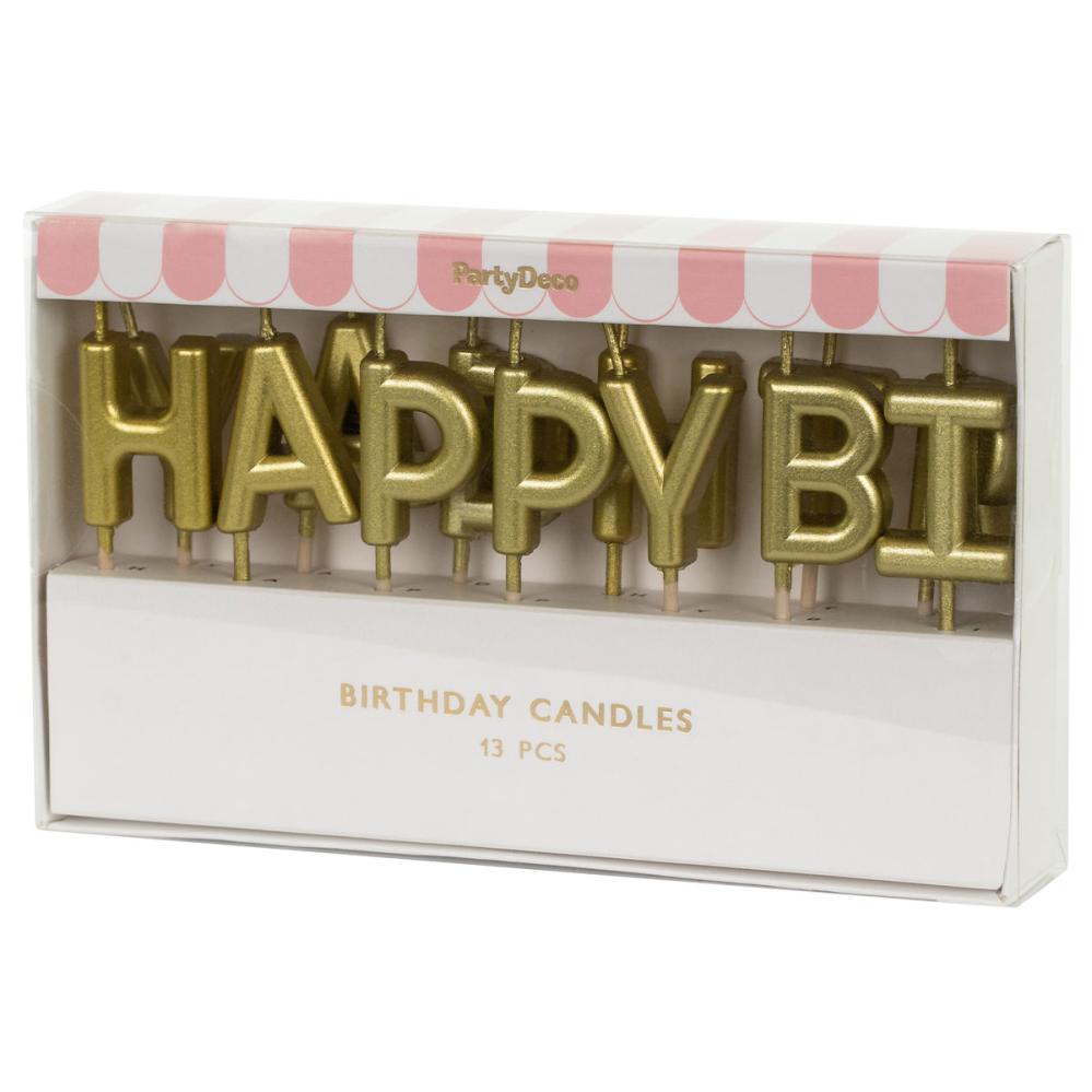Happy Birthday Kirjainkynttilät Kulta sisältää kolmetoista kirjainmuotoista kakkukynttilää, jotka muodostavat tekstin "HAPPY BIRTHDAY" kultaisena.