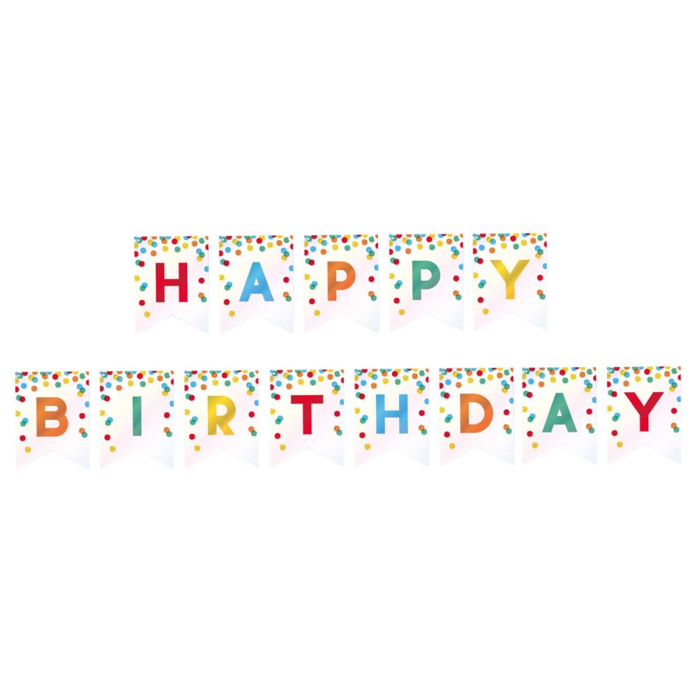 Happy Birthday Lippunauha Pisteillä sisältää syntymäpäivälippunauhan, jossa on kolmetoista lippua valkoisessa nauhassa ja jotka muodostavat tekstin "Happy Birthday" valkoisella taustalla, jossa on värikkäitä pisteitä.