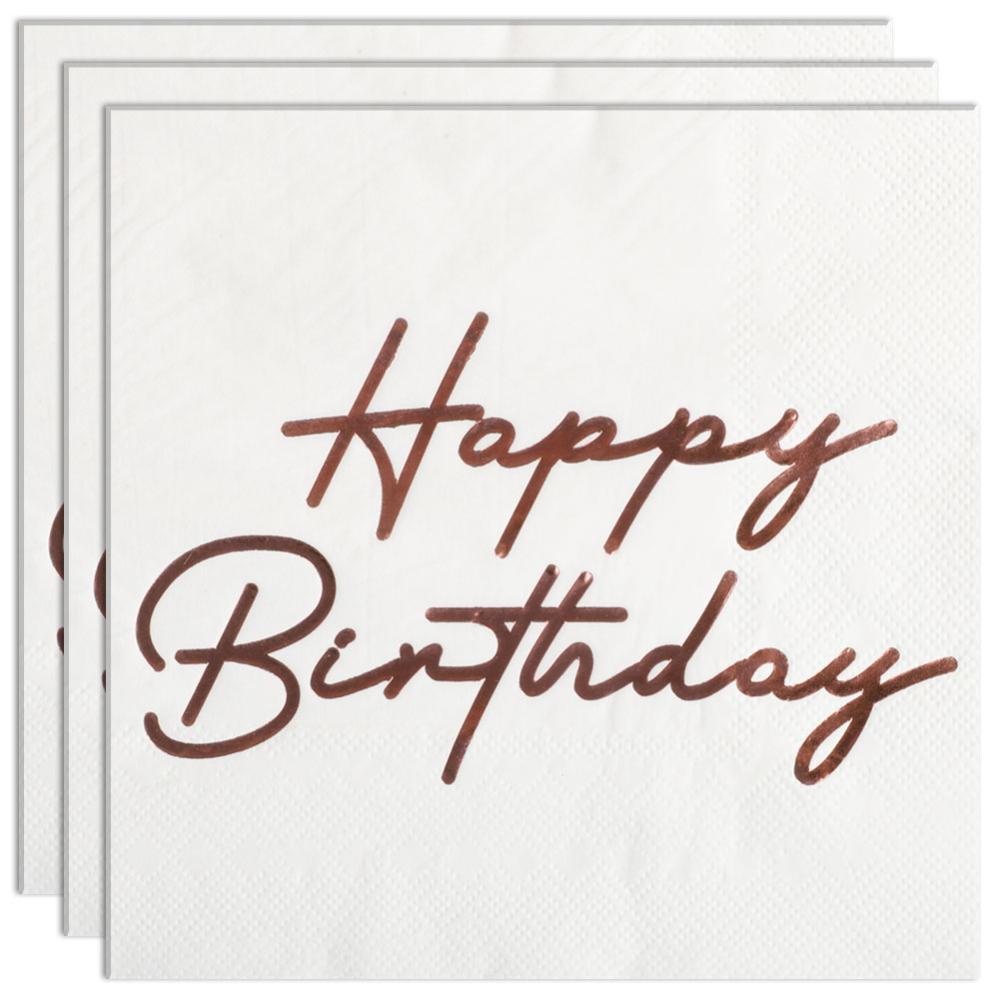 Happy Birthday Servetit Ruusukulta 16 kpl koostuu kuudestatoista valkoisesta kolmikerroksisesta kertakäyttöservetistä, joissa on teksti "Happy Birthday" painettuna kiiltävällä ruusukullalla yhdelle puolelle, kun taas muut puolet ovat täysin valkoiset.