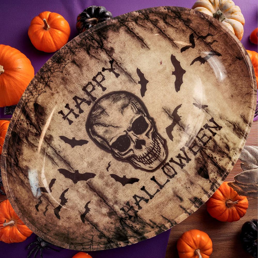 Happy Halloween Tarjoilukulho on luonnonvalkoinen tarjoilukulho, jota koristaa musta pääkallo, mustia lepakoita, mustia hämähäkinverkkoja ja teksti "HAPPY HALLOWEEN" mustana.