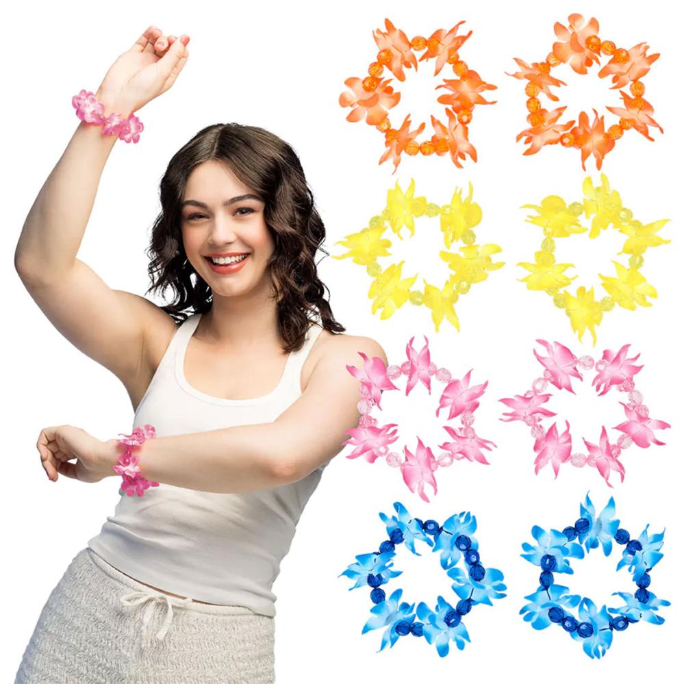 Kukkarannekoru sopii rannalle, juhliin ja teemailtoihin ja siinä on joustava lanka, joka istuu mukavasti ja tekee siitä helpon käyttää koko päivän. Tämä rannekoru tuo havaijilaisen tunnelman ja on värikäs yksityiskohta kesällä.