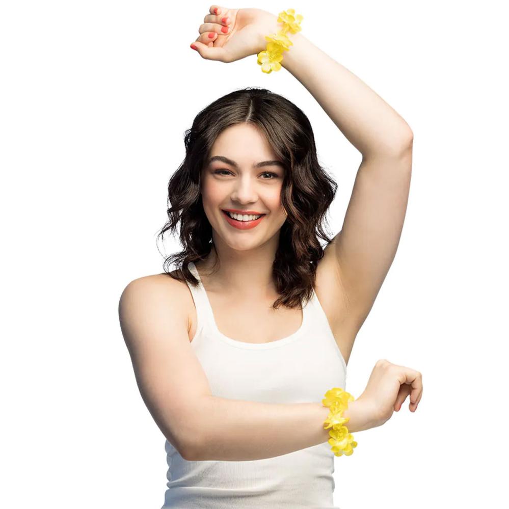 Hawaii Kukkarannekoru Helmillä 2 kpl sisältää kaksi kukkarannekorua yhteensopivilla helmillä. Rannekoruja on saatavana neljässä värissä: oranssi, vaaleanpunainen, sininen tai keltainen.