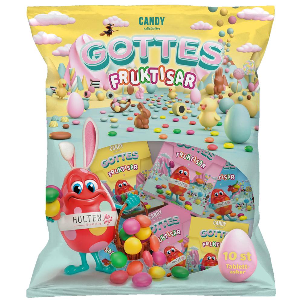 Hedelmäpastillit Pääsiäinen 10 kpl 140g sisältää monivärisiä hedelmänmakuisia pastilleja, jotka on pakattu kymmeneen pääsiäisaiheiseen pakkaukseen.