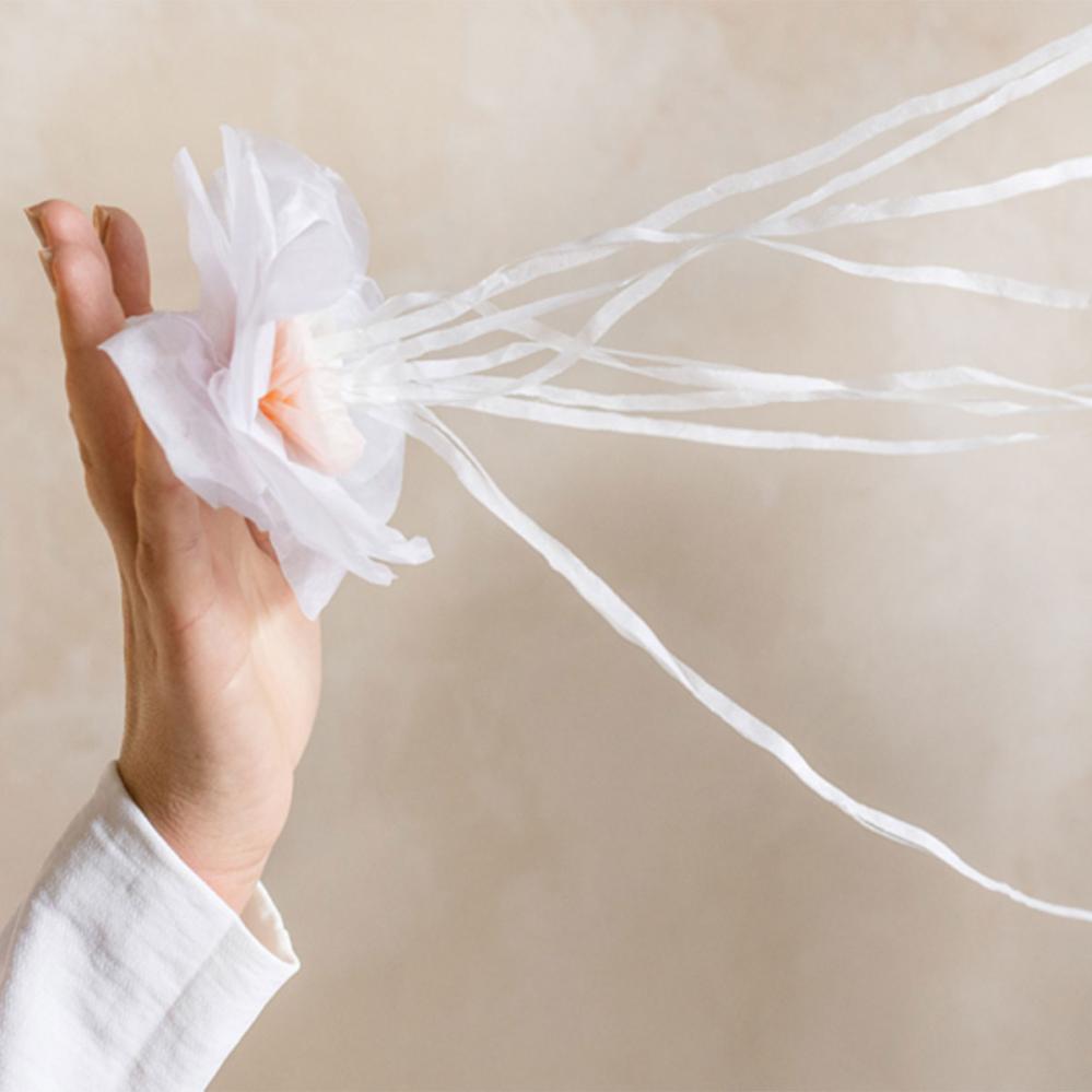 Heitetyt Serpentiinit Kukat 10-kpl sisältää kymmenen valkoista, käsissä pidettävää kukkaa, jotka päästävät ilmoille valkoisia paperiserpentiinejä, kun valkoista narua vedetään ulos.