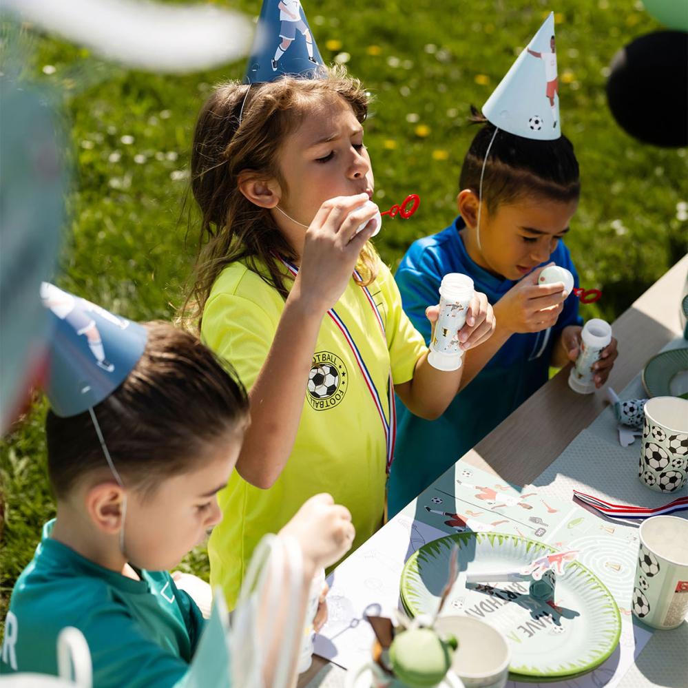 Tee lasten jalkapalloteemaisesta juhlasta vieläkin hauskempi näillä saippuakuplapulloihin tarkoitetuilla lastenjuhlatarvikkeilla. Kuusi värikkäillä jalkapallokuvioilla varustettua tarraa tekevät juhlista leikkisät ja persoonalliset.