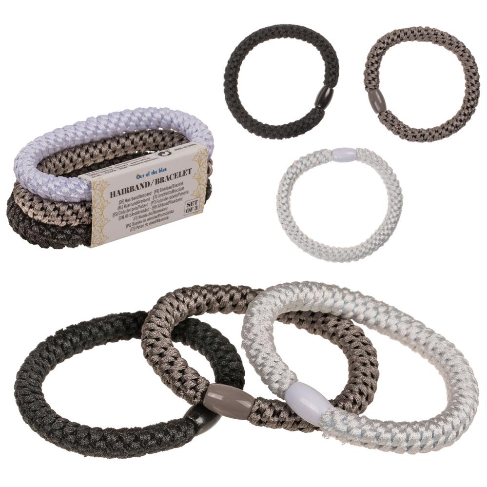 Hiuslenkit Musta/Harmaa/Valkoinen 3 kpl koostuu kolmesta kestävästä hiuslenkistä väreissä musta, harmaa ja valkoinen. Niissä on kudottu kuvio ja koristeellinen keskiosa. Niitä voi käyttää myös tyylikkäinä rannekoruina.