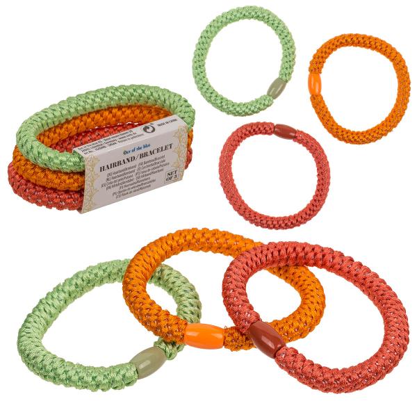 Hiuslenkit Värisekoitus 3 kpl sisältää kolme kestävää hiuslenkkiä väreissä punainen, oranssi ja vihreä. Niissä on kudottu kuvio ja koristeellinen keskiosa. Niitä voi käyttää myös tyylikkäinä rannekoruina.