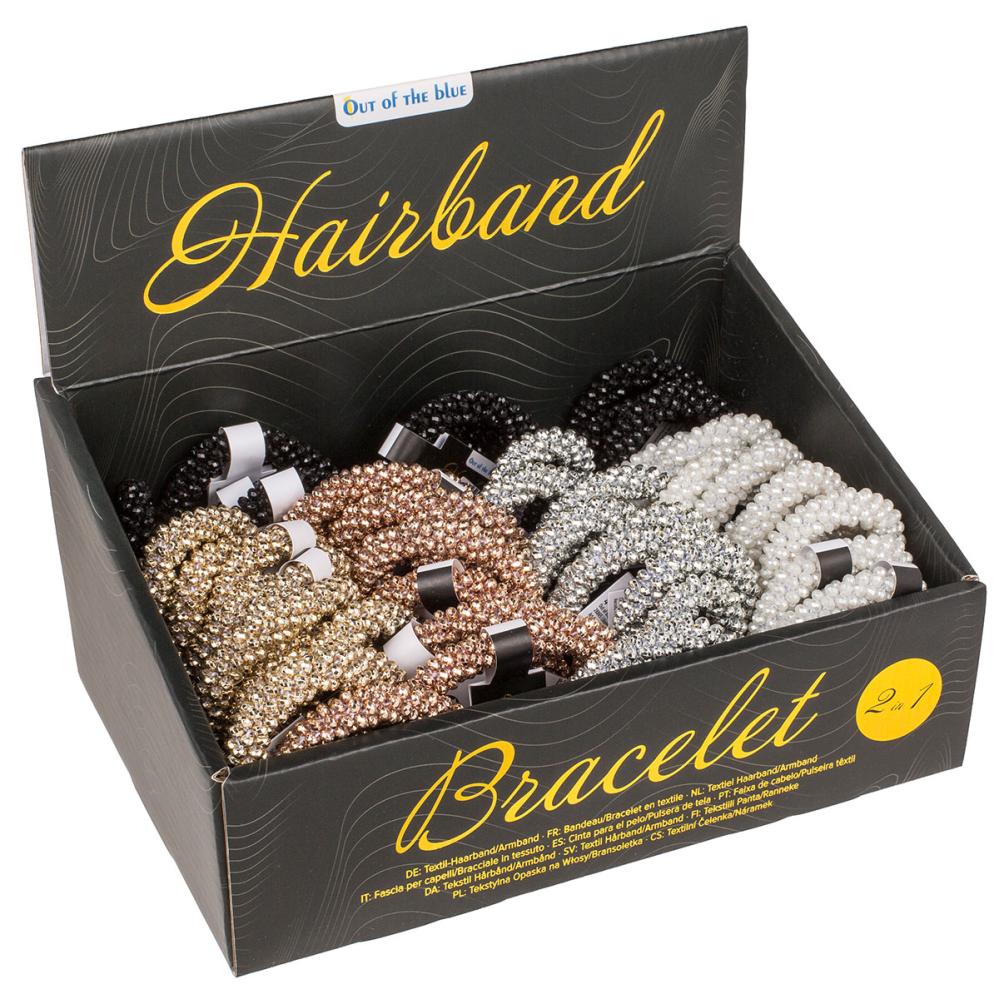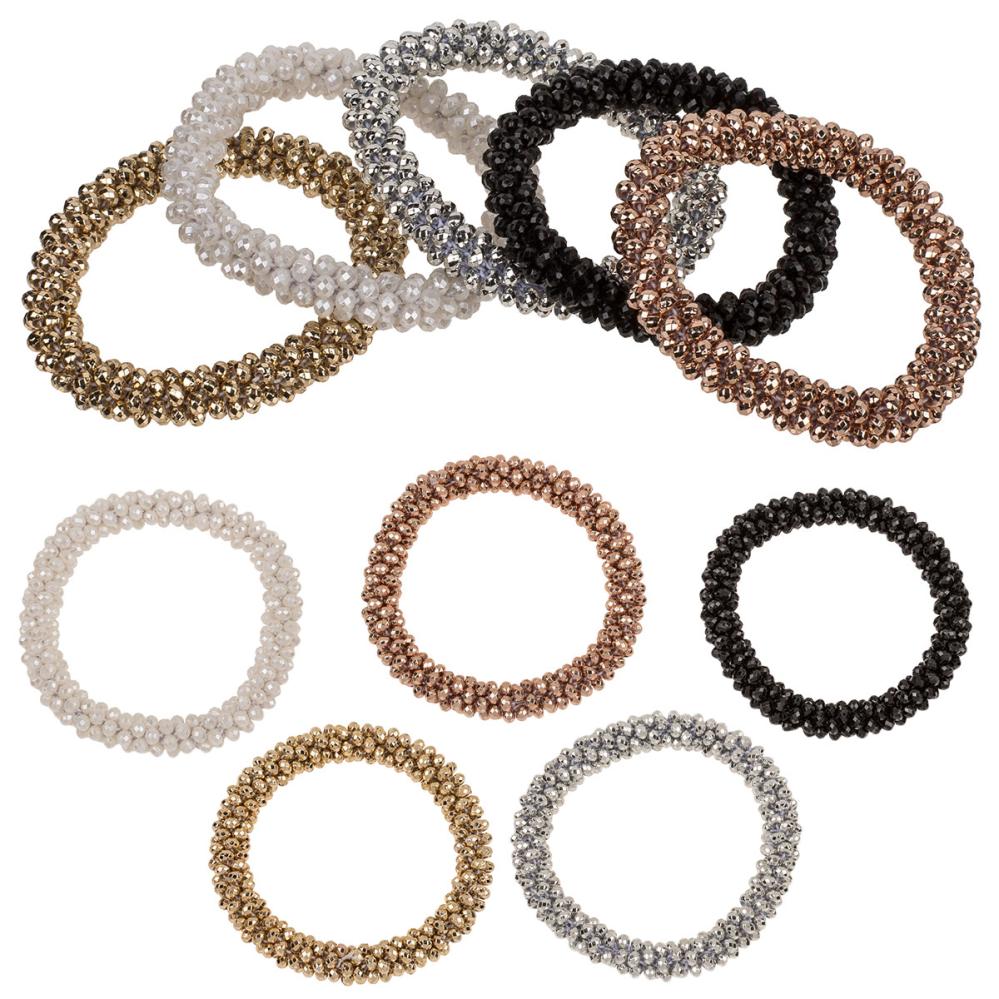 Hiuslenkki Kimaltelevilla Helmillä koostuu joustavasta nauhasta, joka on koristeltu pienillä, kiiltävillä helmillä, ja sitä voi käyttää myös rannekoruna. Hiuslenkkiä on saatavana viidessä eri värissä: musta, valkoinen, ruusukulta, kulta ja hopea.