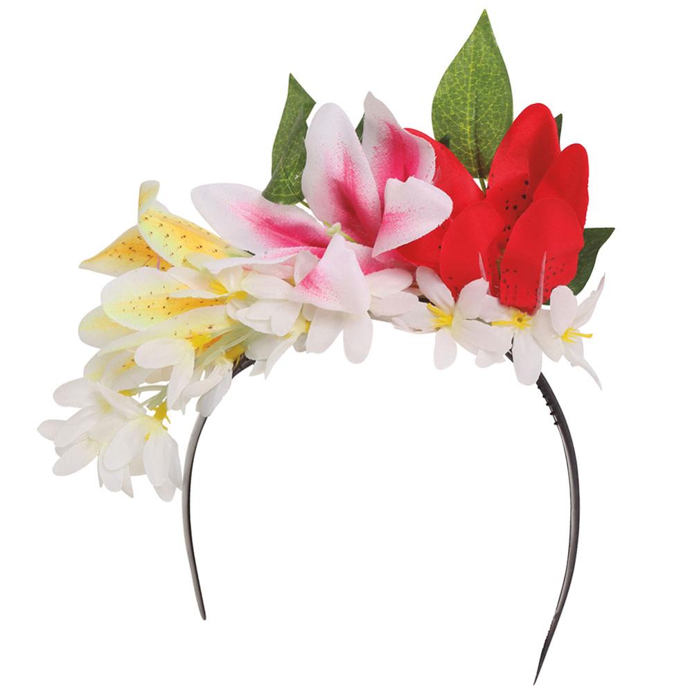 Hiuspanta Orkideoilla ja Lehdillä sisältää mustan hiuspannan, jossa on valkoisia, keltaisia, vaaleanpunaisia ja punaisia tekokukkaisia orkideoita sekä vihreitä lehtiä.