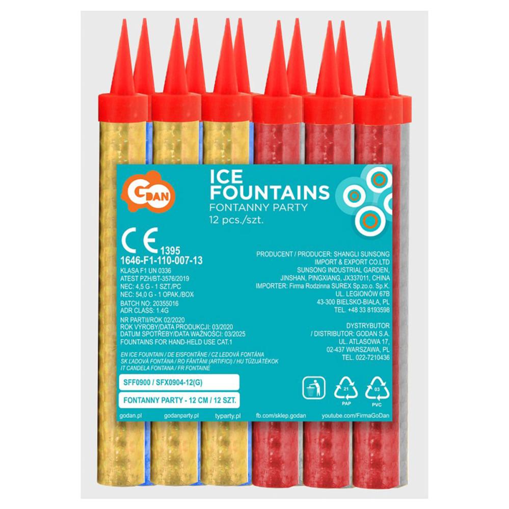 Hohtavat Jääsoihdut Värinen 12-kpl sisältää 12 kpl hohtavia jääsoihtuja väreissä punainen, sininen, hopea ja kulta. Jääsoihduissa on myös alhaalla punainen muovikärki, jonka ansiosta ne on helppo painaa esimerkiksi kakkuun tai jälkiruokaan.