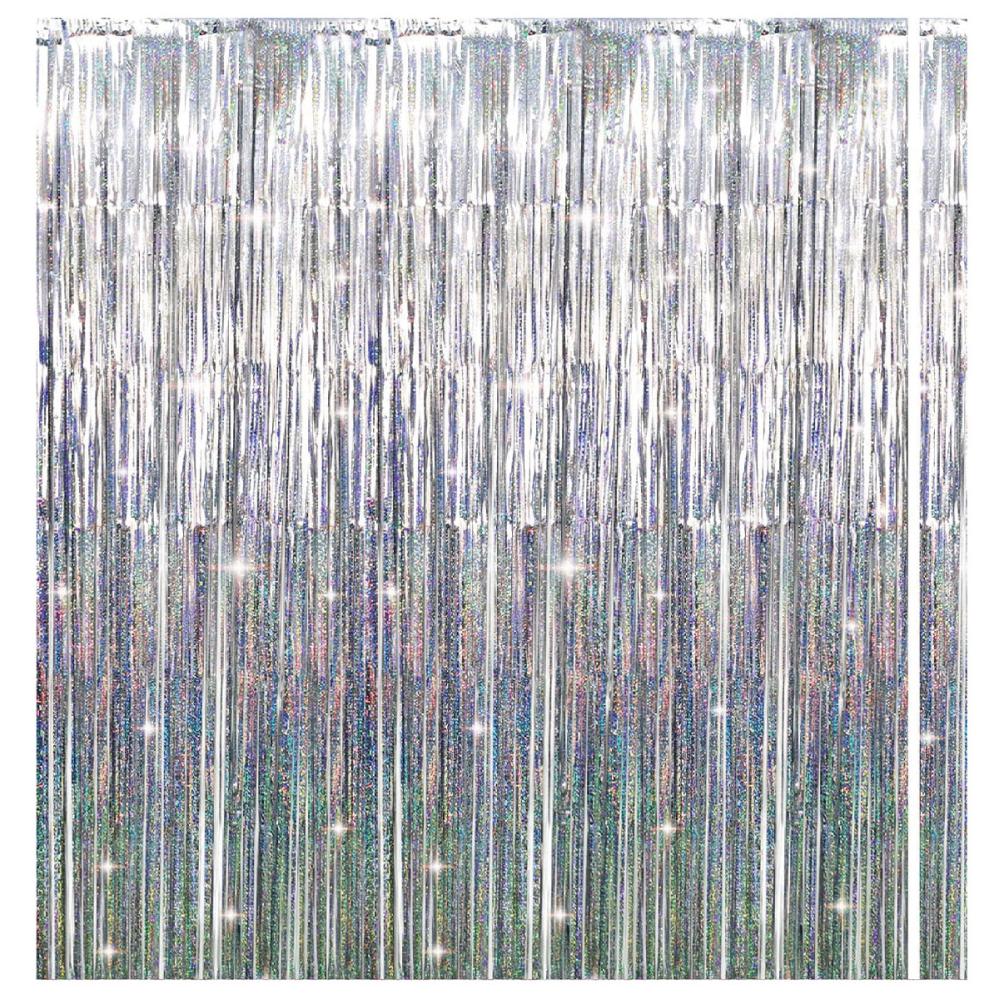 Hopea Verho Pilkuilla sisältää oven verhoilun, jossa on pitkiä ja ohuita hopeanvärisiä suikaleita, joissa on pilkkuja, jotka kimmeltävät sateenkaaren väreissä.