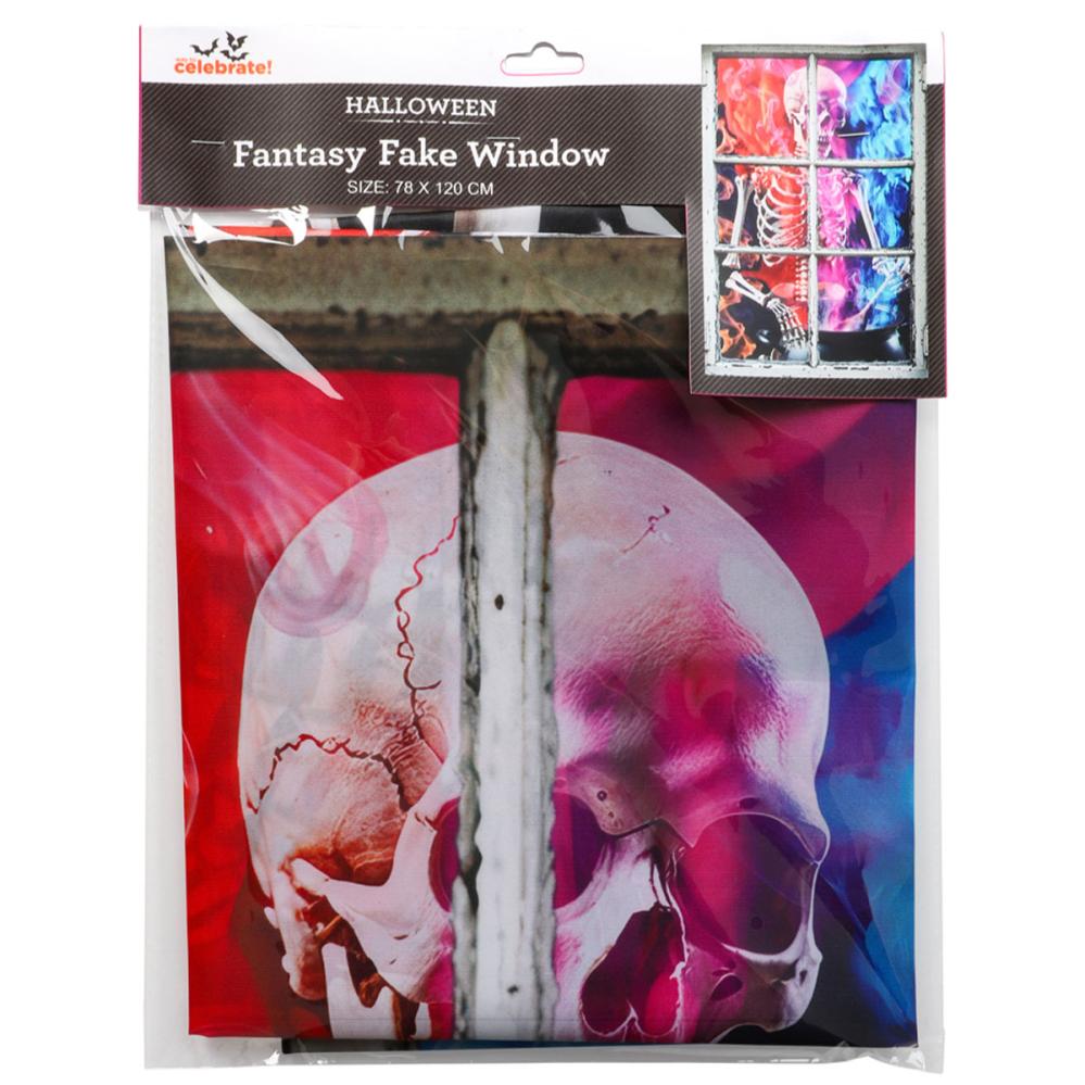 Ikkunakoriste Halloween Maaginen Luuranko sisältää kangaskoristeen, jossa luuranko hämmentää noidanpataa, josta nousee oranssia, punaista, violettia ja sinistä savua. Koriste ripustetaan ikkunan sisäpuolelle niin, että kuva on ulospäin, ja se luo illuusion siitä, että luuranko katsoo ulos ikkunasta.