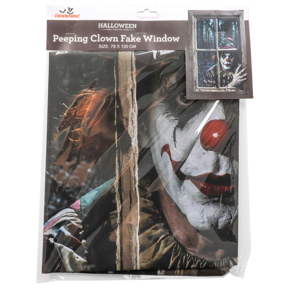 Ikkunakoriste Halloween Pelottava Klovni koostuu kangaskoristeesta, jossa on pelottavan klovnin kuva luontotaustaa vasten. Koriste ripustetaan ikkunan sisäpuolelle, kuva sisäänpäin, ja se luo illuusion siitä, että klovni katsoo sisään ikkunasta.