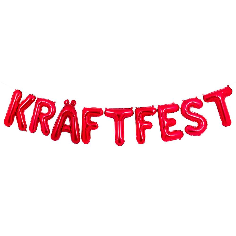 ilmapalloköynnös Kräftfest Punainen 35 cm sisältää yhdeksän punaista kirjaimen muotoista foliopalloa, jotka muodostavat sanan "KRÄFTFEST". Pallot täytetään ilmalla mukana tulevan puhallusputken avulla, ja niissä on lenkit helppoa ripustamista varten mukana tulevalla valkoisella narulla.