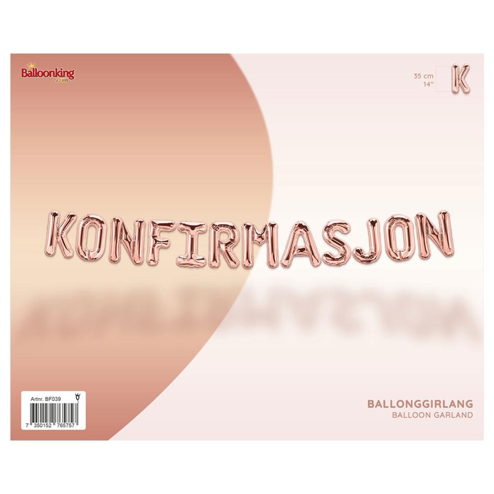 Ilmapallonauha Konfirmasjon Ruusukulta sisältää kaksitoista kirjainmuotoista foliopalloa, jotka muodostavat sanan "KONFIRMASJON" ruusukullassa. Ilmapallot täytetään ilmalla mukana tulevalla pillillä ja niissä on lenkit helppoa ripustamista varten mukana tulevan narun avulla.