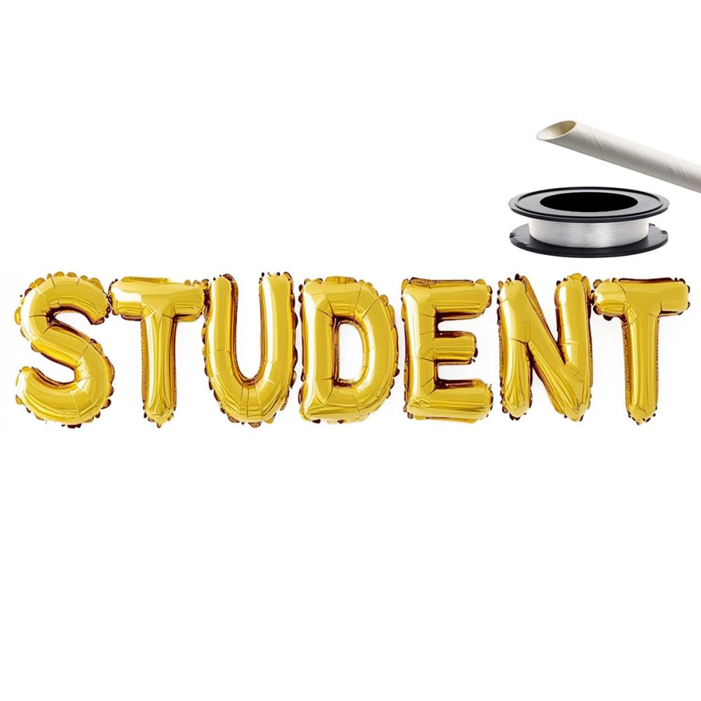 Ilmapalloviirinauha Student Kulta sisältää seitsemän kullanväristä kirjainmuotoista foliopalloa, jotka muodostavat sanan "STUDENT". Pallot voidaan täyttää ilmalla mukana tulevalla pillillä ja ripustaa mukana tulevalla valkoisella narulla.