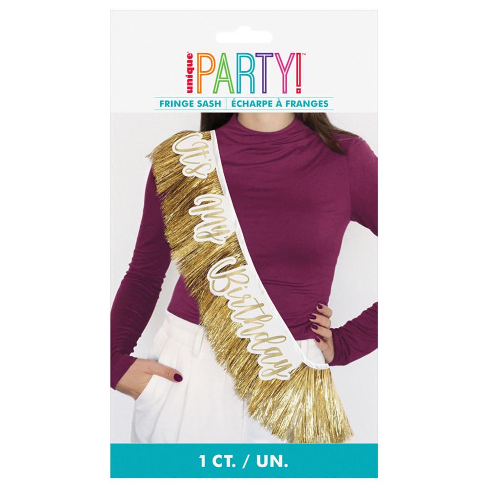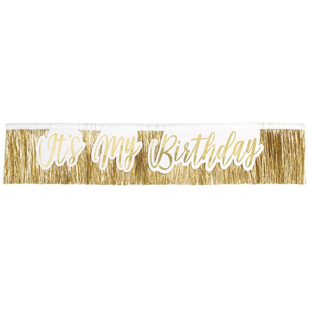 It's My Birthday Olkanauha Hapsuilla Kulta sisältää valkoisen olkanauhan, jossa on teksti "It's My Birthday" ja pitkät kultaiset hapsut.