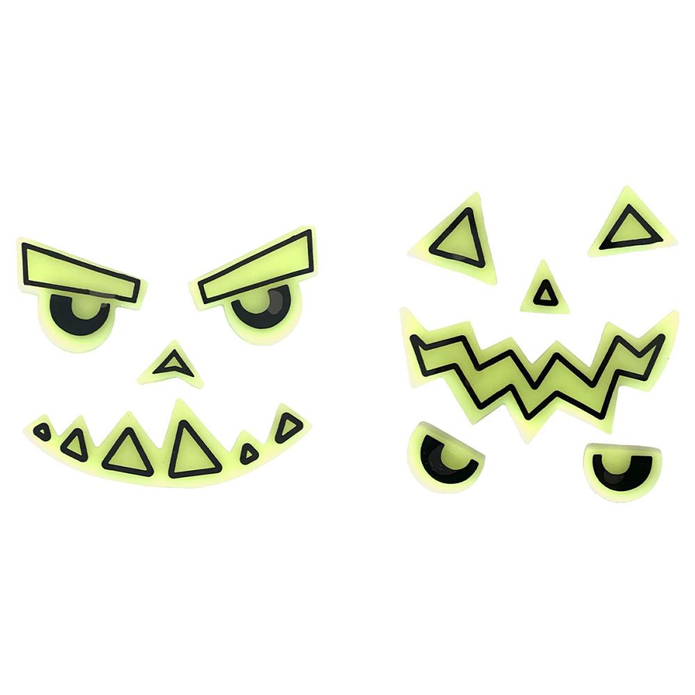 Itsevalaisevat Tarrat Kurpitsa 2-kpl sisältää yhden arkin hyytelömäisestä muovista valmistettuja itseliimautuvia, itsevalaisevia tarroja, joissa on kaksi neonvihreää kurpitsan naamaa mustin yksityiskohdin.