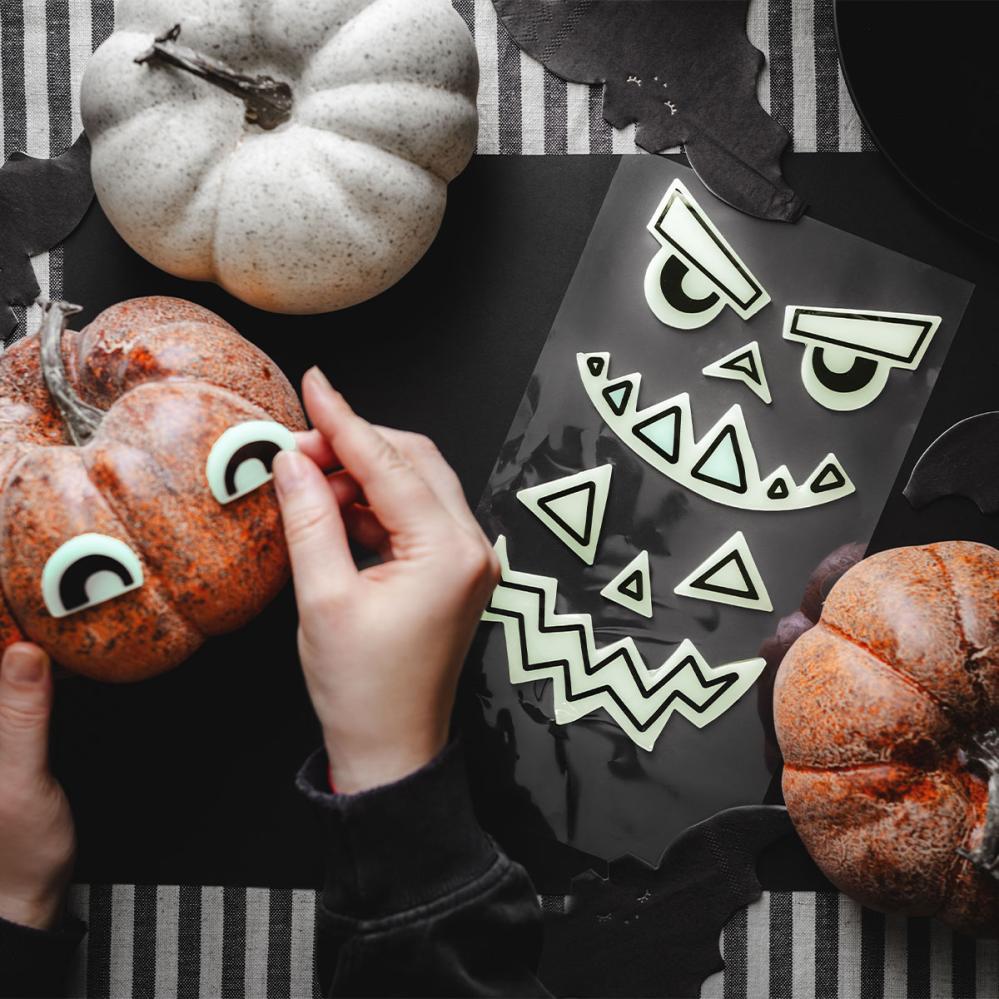 - Itseliimautuvat tarrat, joissa on 2 itsevalaisevaa kurpitsan naamaa