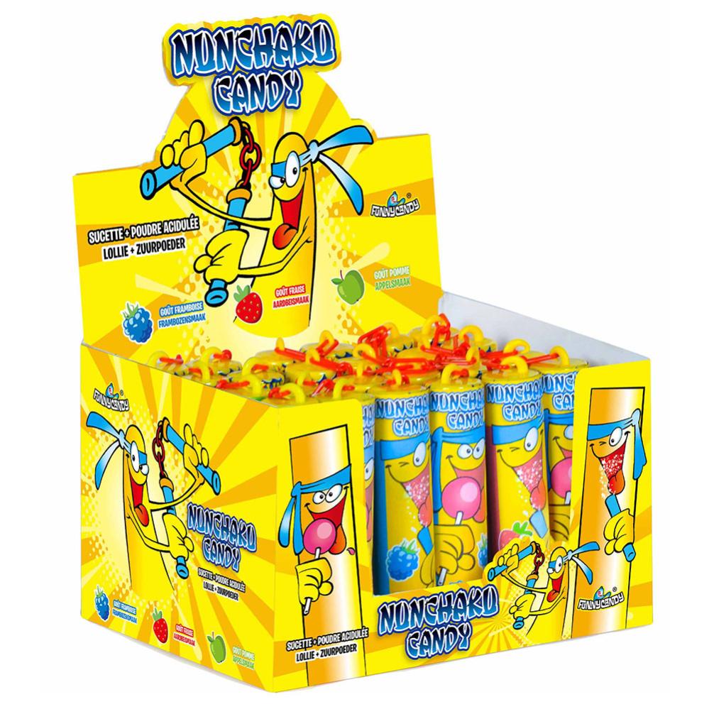 Karkkitikkari ja karkkijauhe upeissa nunchakuissa! Dippaa tikkari karkkijauheeseen ja nauti superherkullisista mauista samalla kun olet valmiina taistelemaan. Todella hauska karkki, joka sopii täydellisesti lastenjuhliin, halloweeniin ja pääsiäiseen.