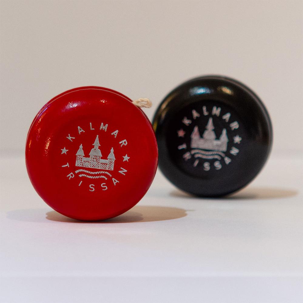 Jojo Kalmartrissan on klassinen puinen jojo, jossa on Kalmarin linnan kuva ja teksti "Kalmartrissan". Jojoja on saatavilla punaisena, mustana ja sinisenä, ja saatavilla oleva väri on yllätys.