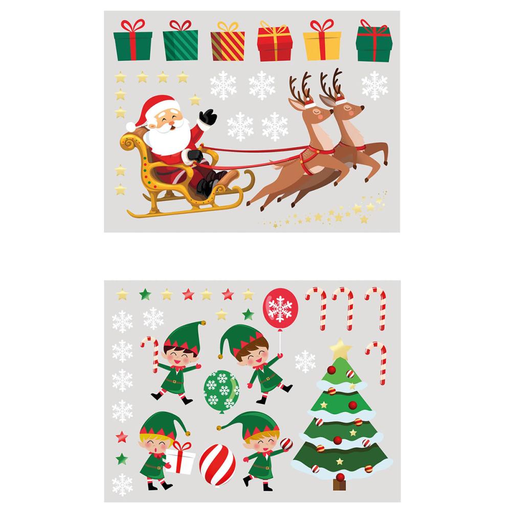 Joulu Ikkunatarrat Joulupukki ja Tontut sisältävät kaksi suurta arkkia ikkunakoristeita, joissa on kuvioina joulupukki ja hänen poronsa, tontut, joululahjat, polkkakarkit, tähdet, lumihiutaleet sekä joulukuusi.