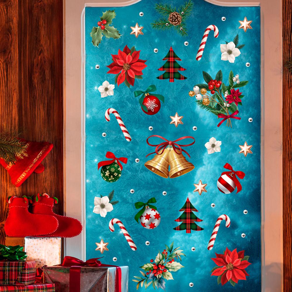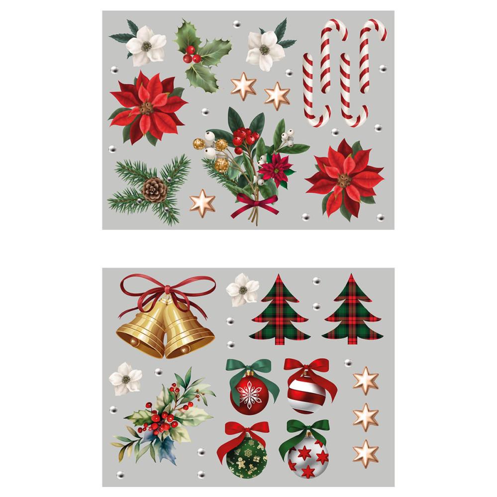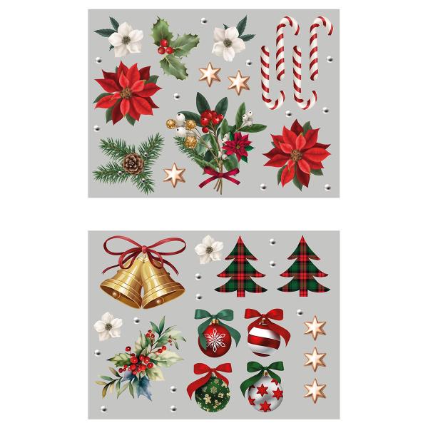 Jouluiset Ikkunatarrat sisältävät kaksi suurta arkkia perinteisiä joulukuvioita, kuten joulukukkia, polkakarkkeja, joulukelloja, joulukuusenpalloja ja tähtiä.