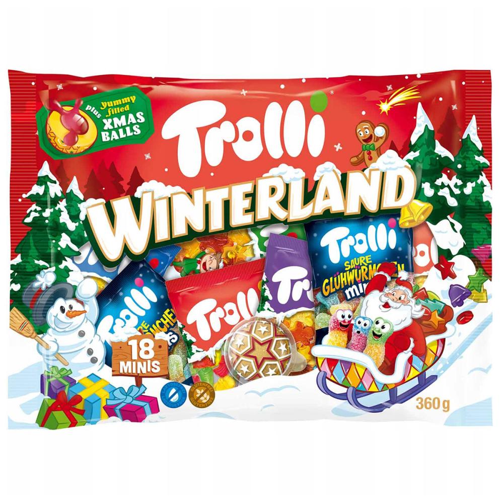 Joulukarkit Talvimaa 360g sisältää kuusitoista pussia viinikumeja ja kaksi hedelmänmakuista ja jouluteemaista vaahtokarkkipalloa.