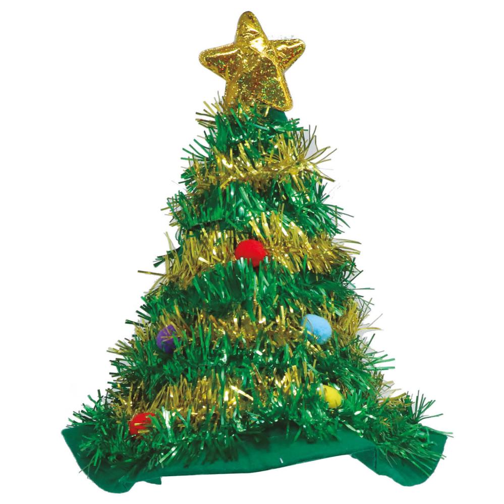 Joulukuusihattu Kultatähdellä on vihreä kangashattu joulukuusen muodossa, jossa on vihreitä ja kullanhohtoisia kimalleköynnöksiä, pieniä pörröisiä palloja eri väreissä ja hohtava kultatähti päällä.