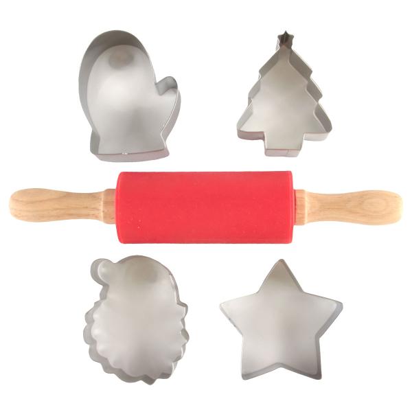 Joululeivontasetti Lapsille 5 kpl sisältää lasten joululeivontasetin, jossa on kaulin ja neljä piparimuottia, kuusen, tähden, joulupukin ja tonttulapasen muodossa.
