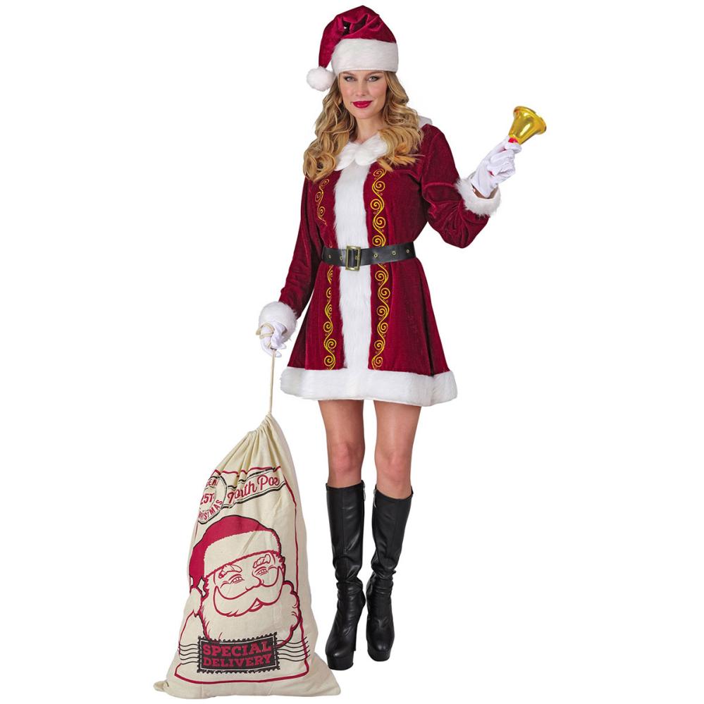 Joulumuorin Joulupuku sisältää lyhyen mekon tummanpunaisena ja valkoisena, jossa on kaulus ja kullanväriset yksityiskohdat, mustan vyötärövyön kultasoljella sekä tummanpunaisen ja valkoisen tonttulakin.