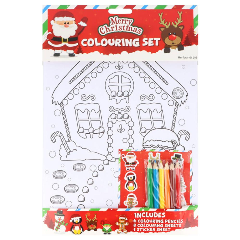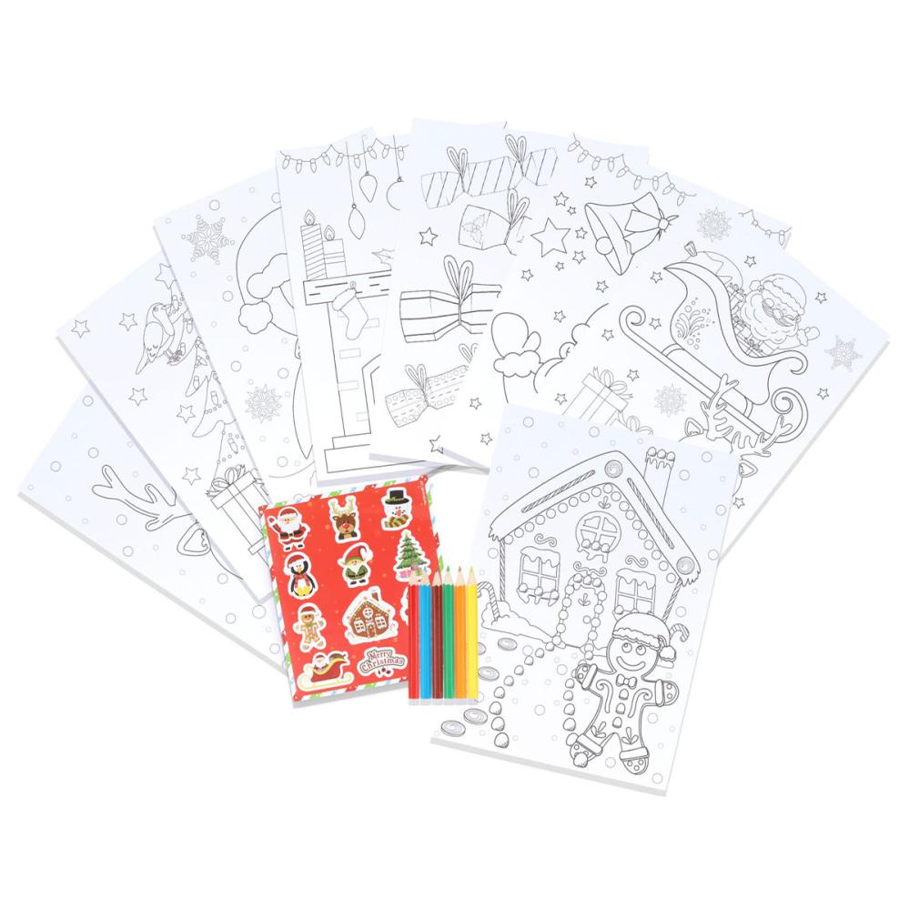 Joulun Värityssetti sisältää kahdeksan yksityiskohtaista A4-arkkia joulumotiiveilla sekä kuusi pientä värikynää väreissä vihreä, sininen, keltainen, oranssi, ruskea ja punainen. Mukana on myös pieni arkki, jossa on kaksitoista tarraa hauskilla joulumotiiveilla, joita voidaan käyttää piirustusten tai muiden pintojen koristeluun.