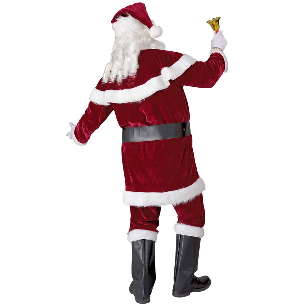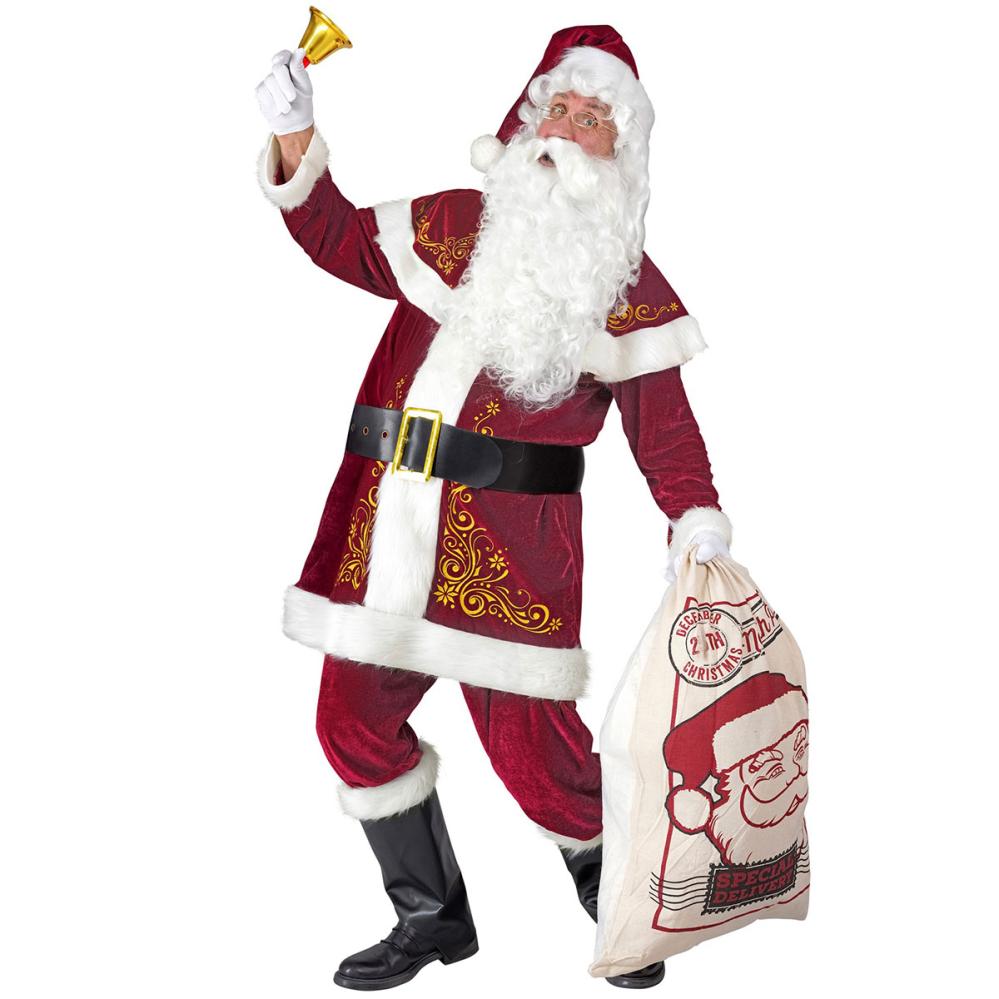 Joulupukin Asu Tummanpunainen sisältää tummanpunaisen ja valkoisen joulupukin takin kullanvärisillä yksityiskohdilla, mustan vyön kultasoljella, tummanpunaiset housut, valkoiset hansikkaat, tummanpunaisen ja valkoisen tonttulakin sekä mustat kengänpäälliset valkoisella turkisreunuksella.